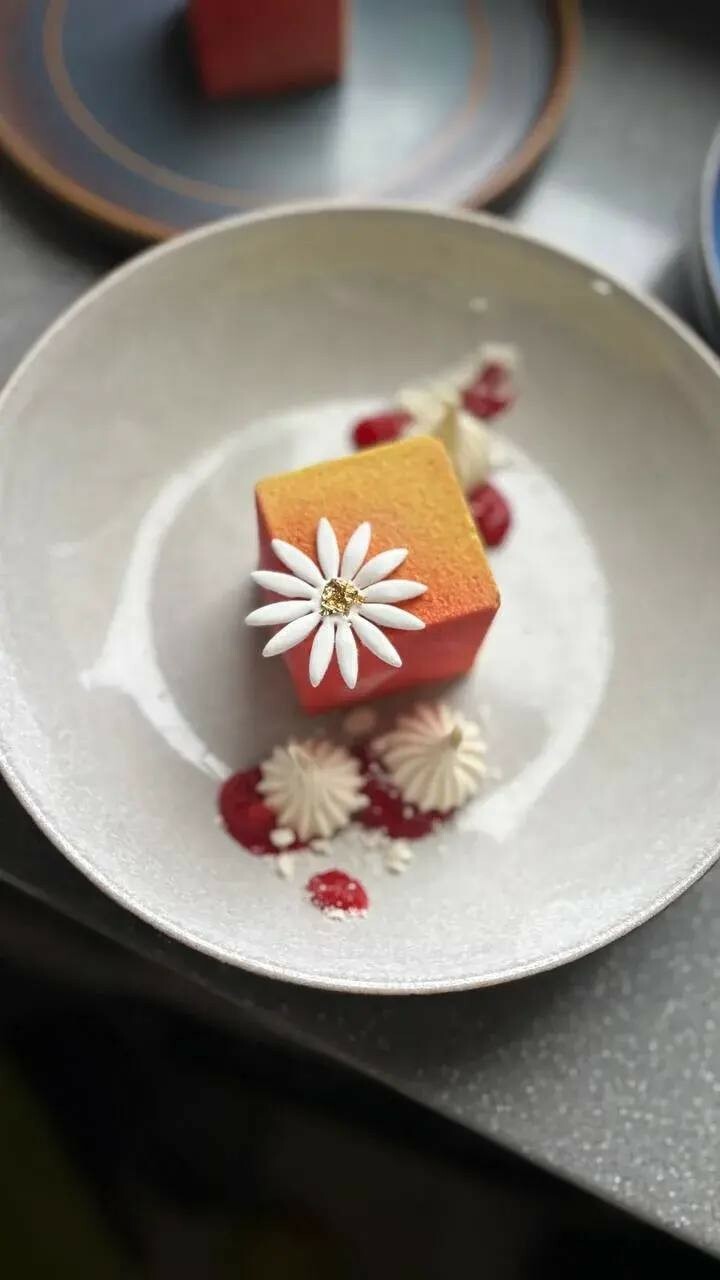 Хрустящая тарталетка, бархатистый франжипан с нотой лайма. Терпкое конфи из черной смородины и нежный ванильный мусс с ароматом бобов тонка. Смесь цитрусов, ягоды и орехов